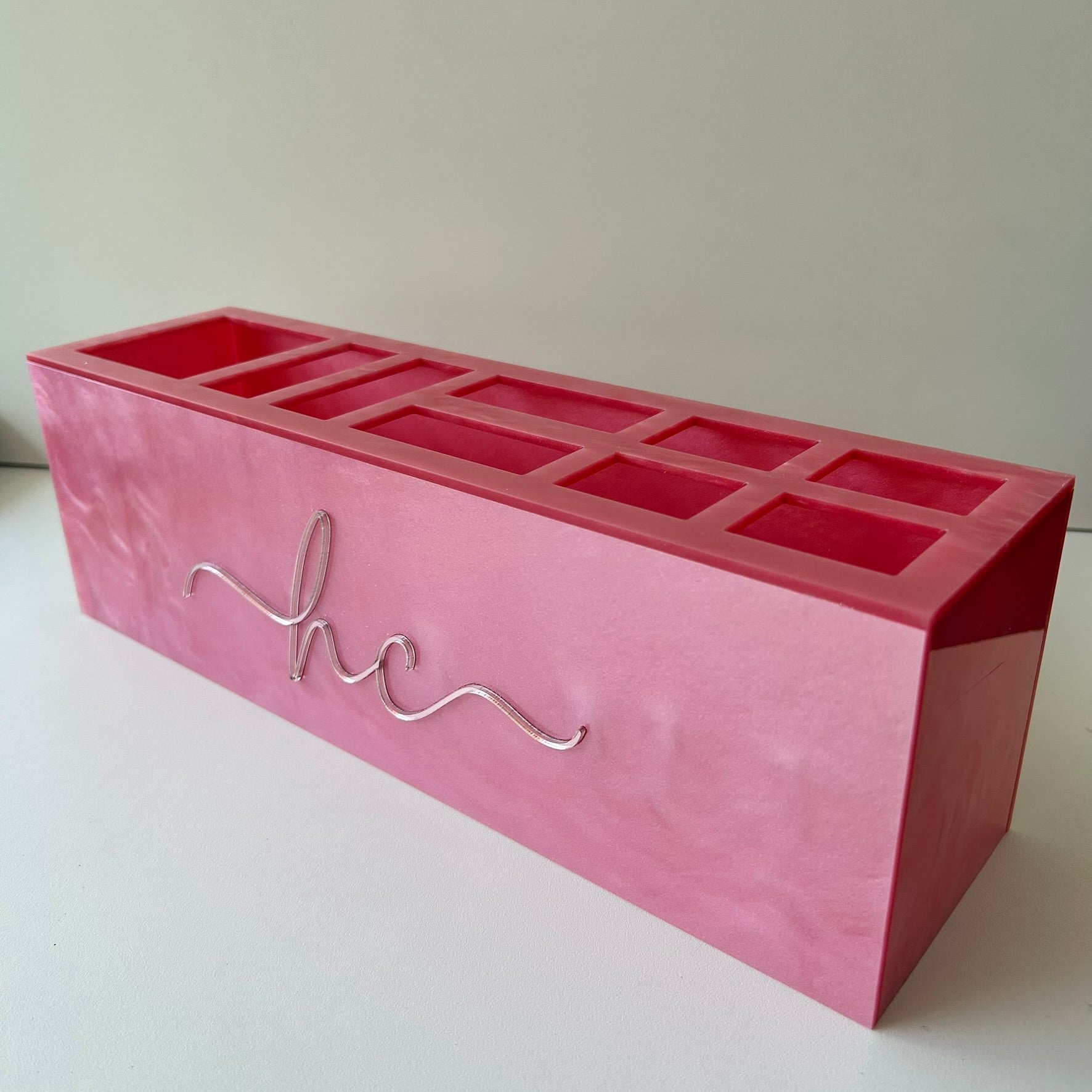 Organização com estilo para profissionais da beleza! O porta-pincéis em acrílico com 9 divisórias personalizado é perfeito para maquiadoras que desejam manter seus pincéis organizados com sofisticação e praticidade.