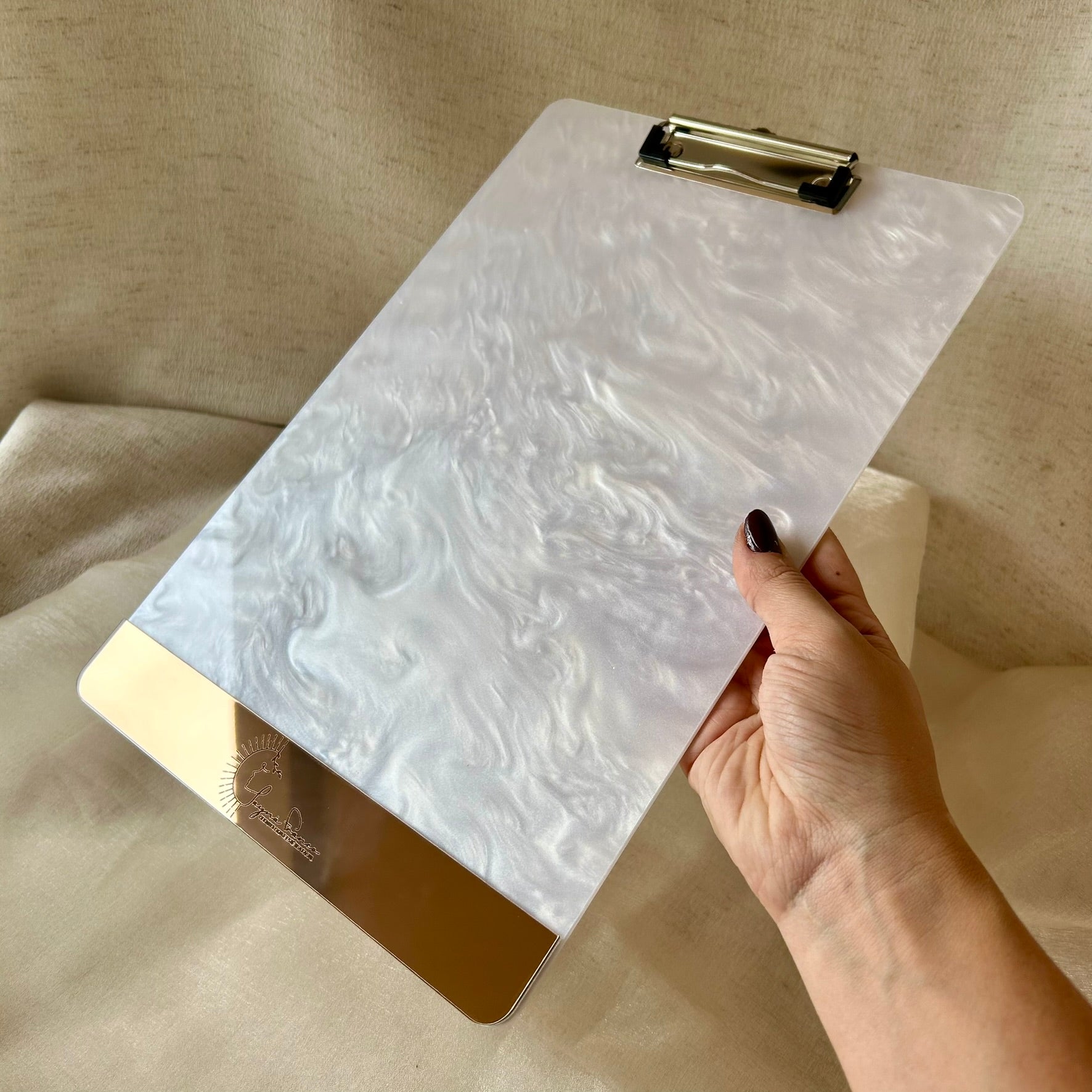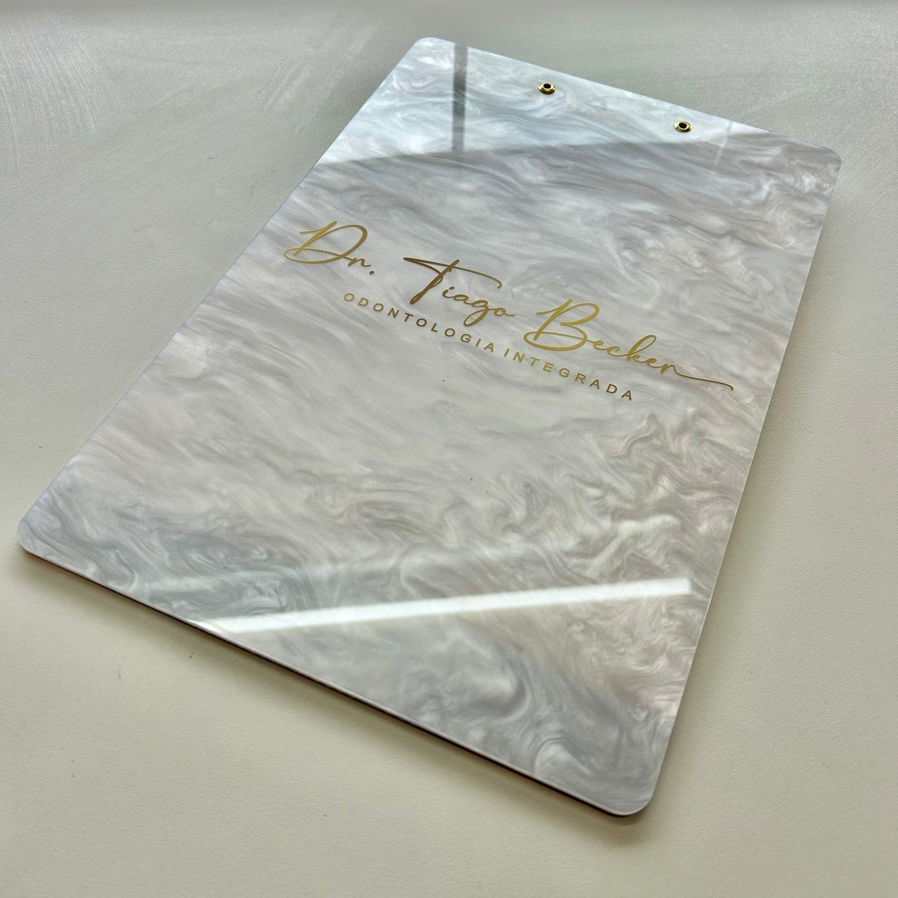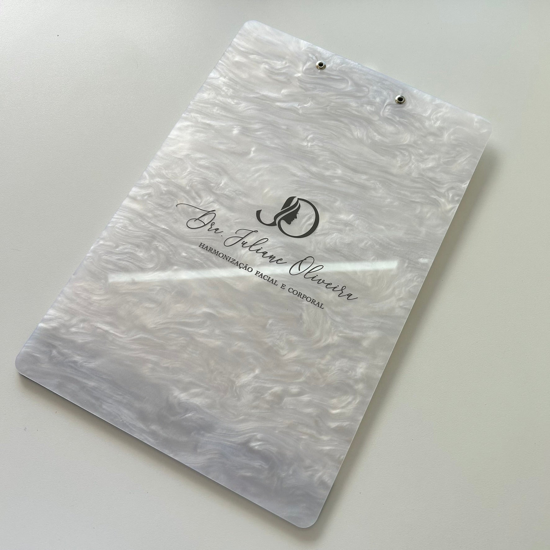 Leve organização e elegância ao seu trabalho com a prancheta personalizada em acrílico A4, com acabamento em madrepérola e espelhado. Ideal para clínicas, consultórios e estúdios que valorizam detalhes sofisticados.
