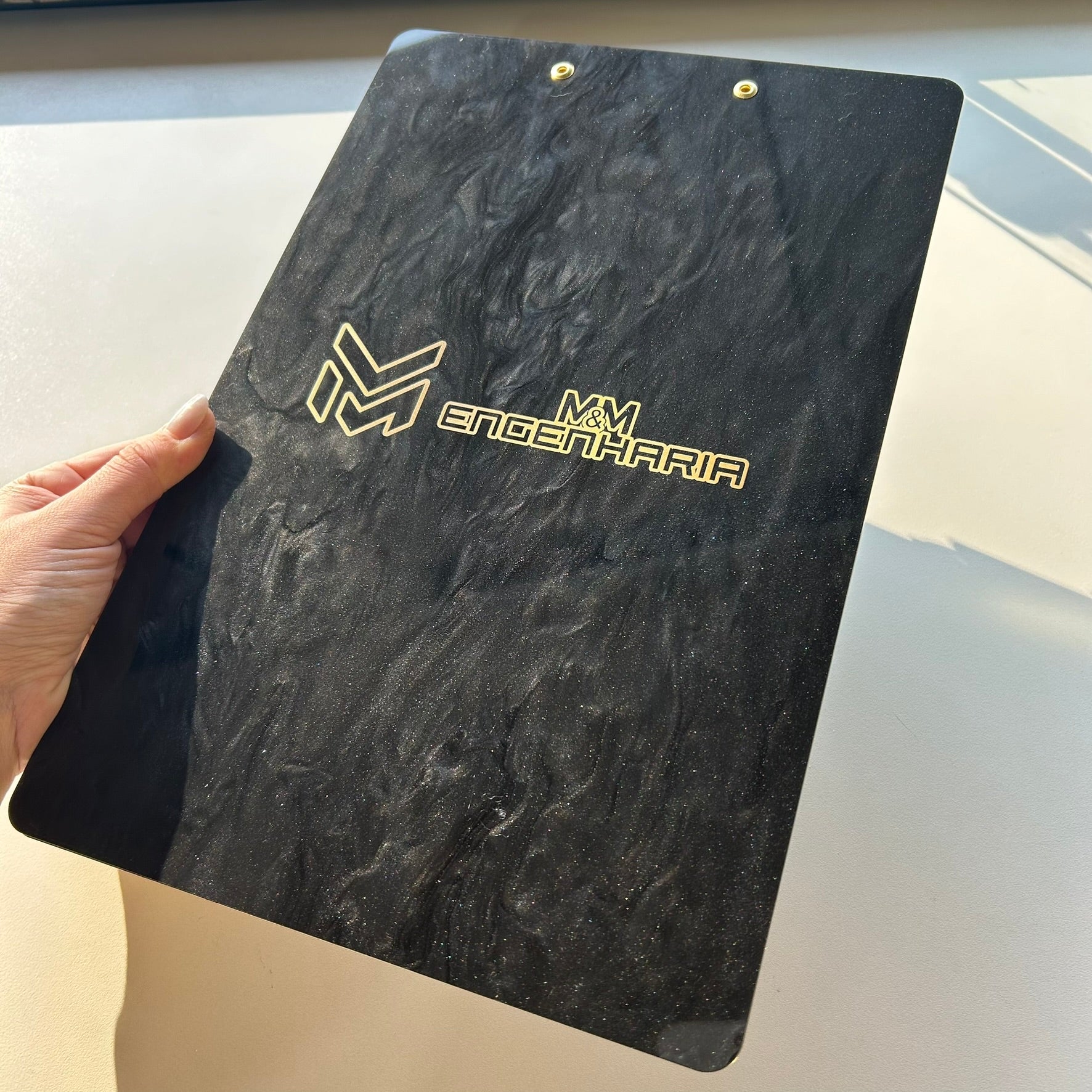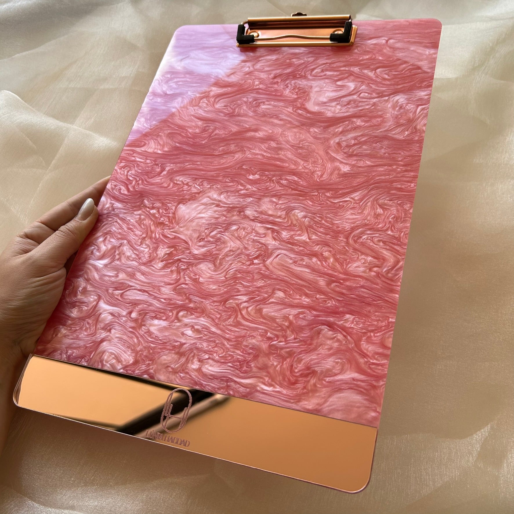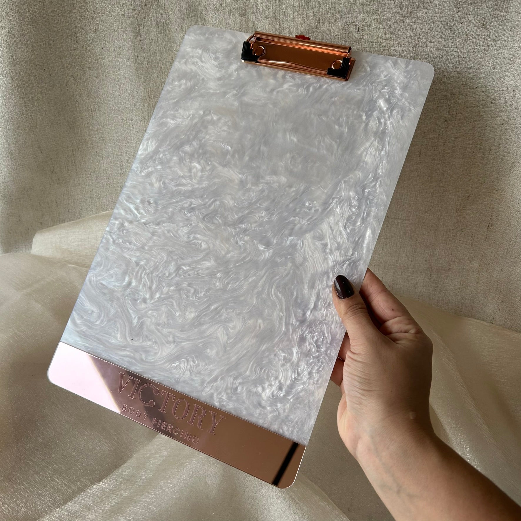 Leve organização e elegância ao seu trabalho com a prancheta personalizada em acrílico A4, com acabamento em madrepérola e espelhado. Ideal para clínicas, consultórios e estúdios que valorizam detalhes sofisticados.